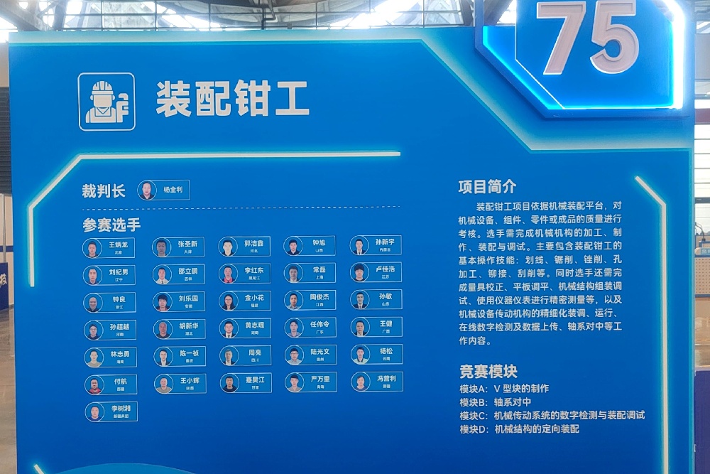 2025年9月19日至23日,中华人民共和国第三届职业技能大赛在河南郑州隆重举行。本届大赛以“技能照亮前程”为主题,共设106个竞赛项目,包括66个世赛选拔项目和40个国赛精选项目。 装配钳工项目作为体现我国制造业基础能力的重要赛项,充分展现了选手们的精湛技艺和职业素养。